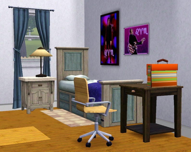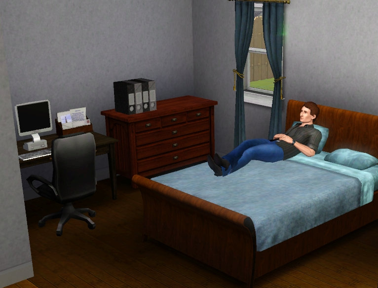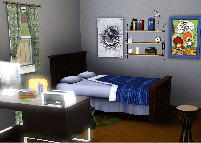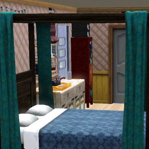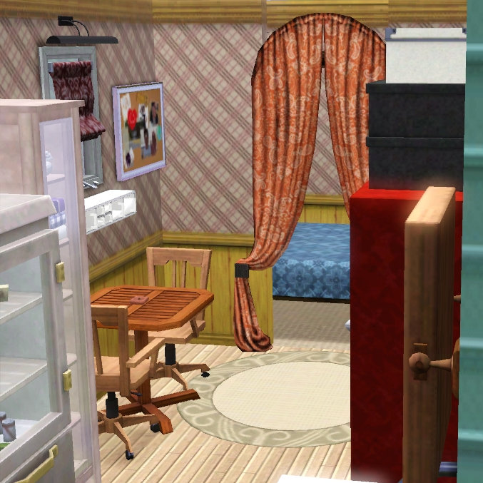 Beyond the stairs to the basement is Jesse’s room – he’s doing some tough calculations on his computer. The wall on the left containing the built-in-closet (backing onto Caleb’s built-in-closet) is removed here.
