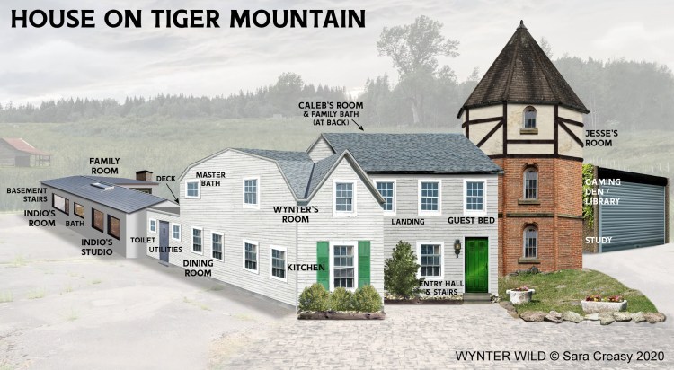 Indio lives in the extension at the back (at the very end is the basement stairs) opposite the family room. The deck runs alongside those rooms and around the living room (not labeled, but it’s straight through from the front door). Jesse moved into the tower. Caleb and Wynter swapped rooms a while after they moved in, so she has the master. The guest bedroom was a nursery for a while…