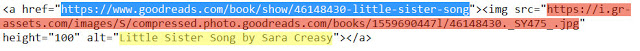 - The img src tag calls up an existing image, which is the book cover hosted on Goodreads.