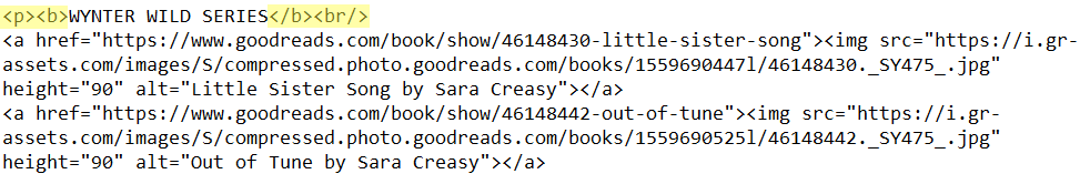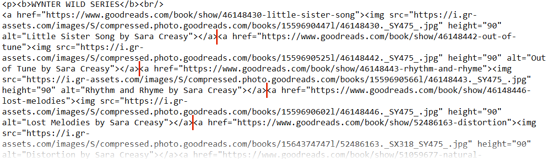 However, if you want them to appear in a single row, as I did, you need to join all that code into one long line. Obviously it won’t look like one long line in your text editor or on the Goodreads edit page, but the line breaks will look rather random after you’ve joined it all up. Below, the red lines indicate where I backspaced to join the lines together.