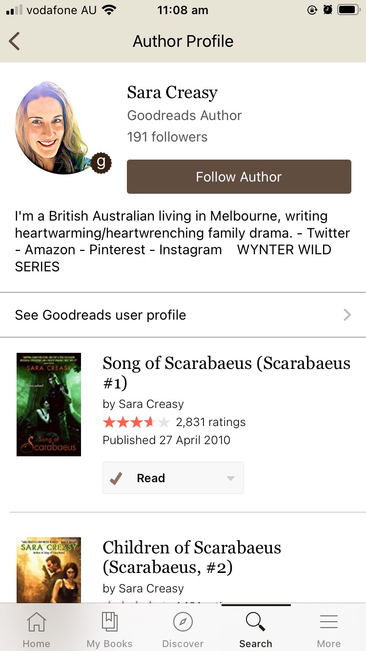 This is my author profile page, as an example, showing the clickable book covers displayed in my bio. You can navigate to any author’s profile by clicking on their name from a book page, or get to your own from Goodreads.com by going to your tiny profile pic at the top right and clicking Profile.