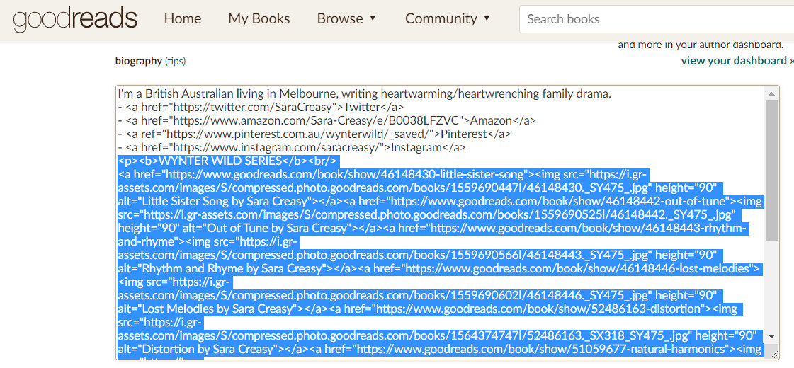 Click SAVE (bottom of the page) and you’ll be taken to your revamped profile page with all your gorgeous books listed right there in your bio!If things aren’t looking quite as you anticipated, don’t panic. Return to the edit page and check your code – that initial code needs to be exactly right.Don’t forget you can play around with the image dimensions (height=”__”). You can also add another subheading with more covers if you need to split your books up into separate sections (if you have multiple series, for example). Just add the subheading before the last /p tag, using line break tags br/ as needed.