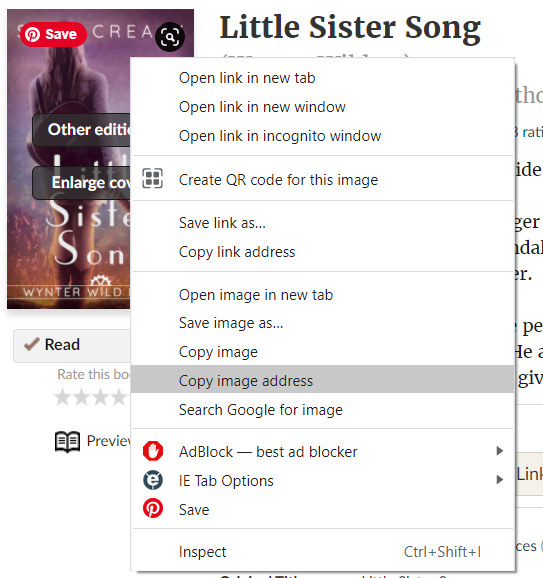 To get the address for the book cover image URL, right-click on the book cover from that same page and select “Copy image address” (Chrome) or “Copy image location” (Firefox).