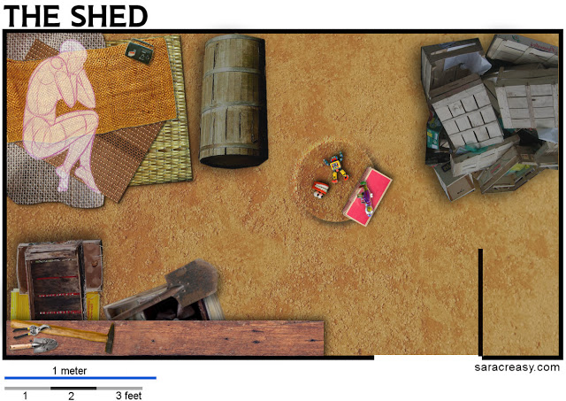 It looks a lot neater here than reality, so imagine heaps of rusty gardening tools, leftover building materials, etc. You willl find a few details that have been, or will be, mentioned in book 10 The Beat Goes On. How many can you spot?