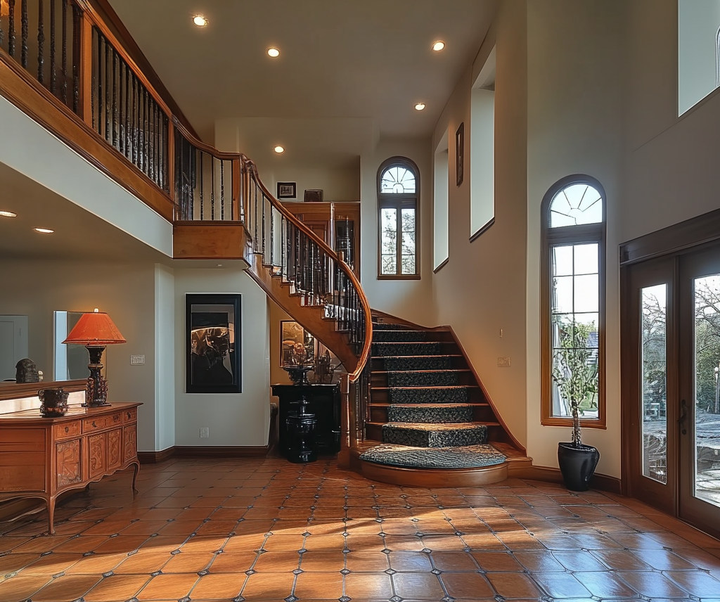 Here’s the elegant entryway and the infamous staircase and interior balcony: